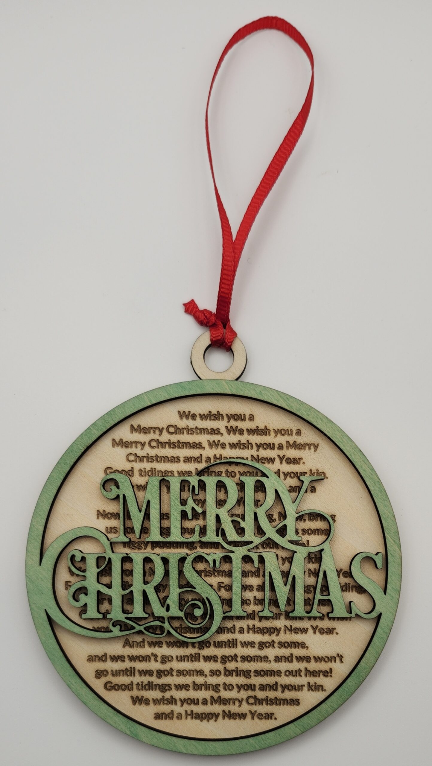 Celebrate the joy of the season with this two-layer laser-cut wooden ornament, featuring an elegant “Merry Christmas” overlay above the engraved lyrics to “We Wish You a Merry Christmas”. Each piece is carefully crafted to showcase fine laser detail and layered depth that captures both artistry and tradition.