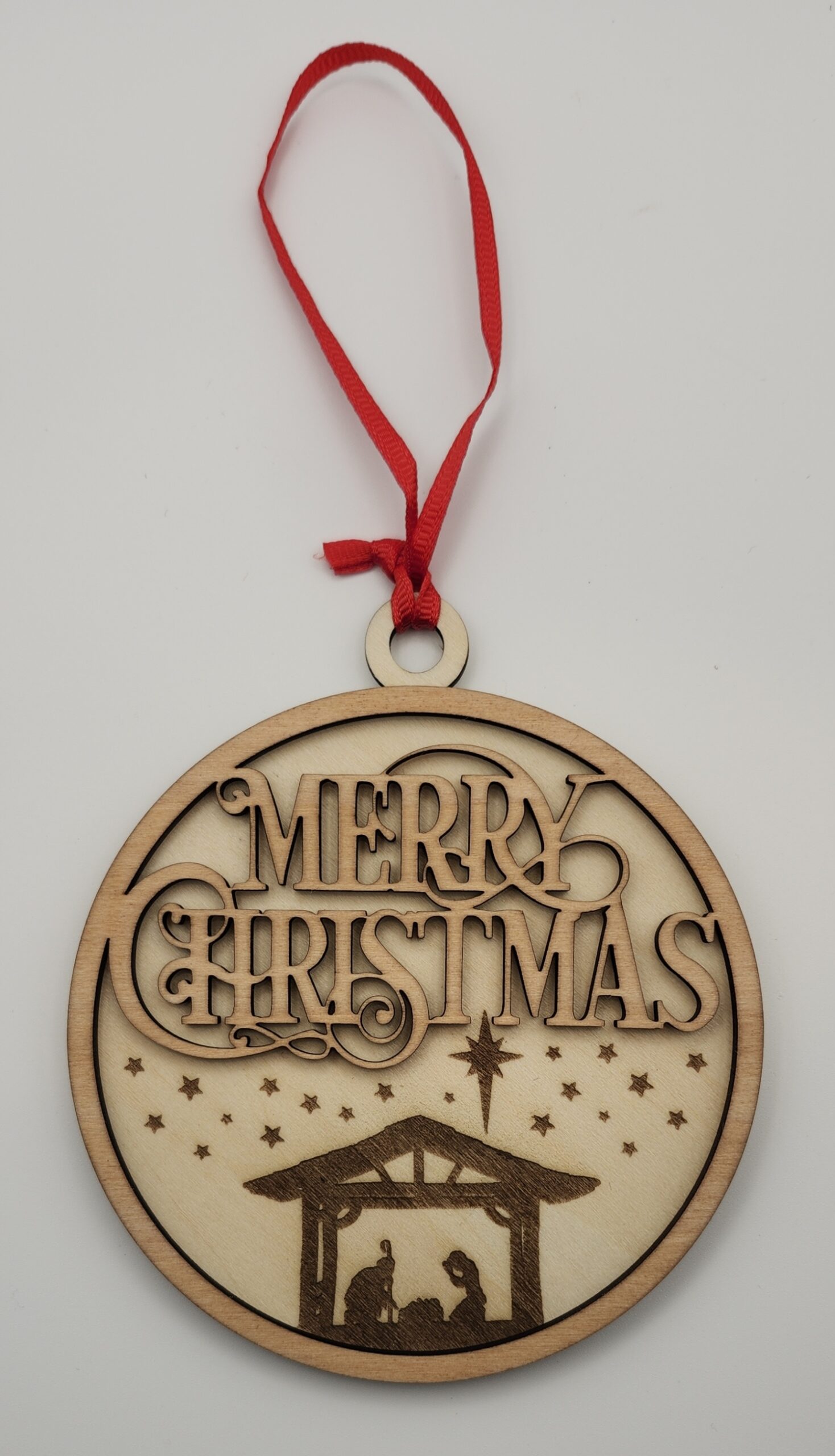 Honor the true spirit of Christmas with this two-layer laser-cut ornament, featuring a layered “Merry Christmas” design over a beautifully detailed Manger scene. The background includes detailed silhouettes’ of Mary, Joseph, and Jesus in the manger, illuminated by the North Star, representing the real reason for Christmas.
