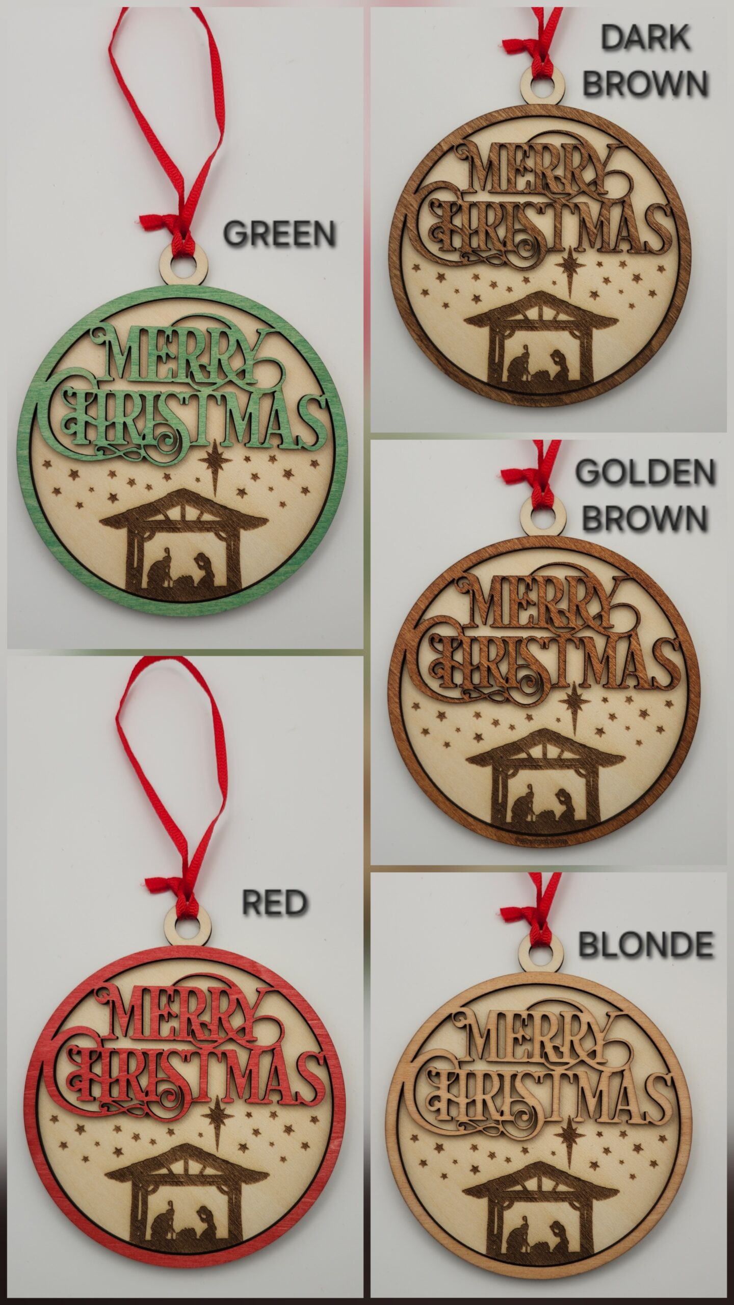 Available in 5 color options to create a timeless keepsake that blends modern craftsmanship with the sacred beauty of the season, perfect for your tree or as a heartfelt gift. Includes a Red Ribbon for hanging as shown.