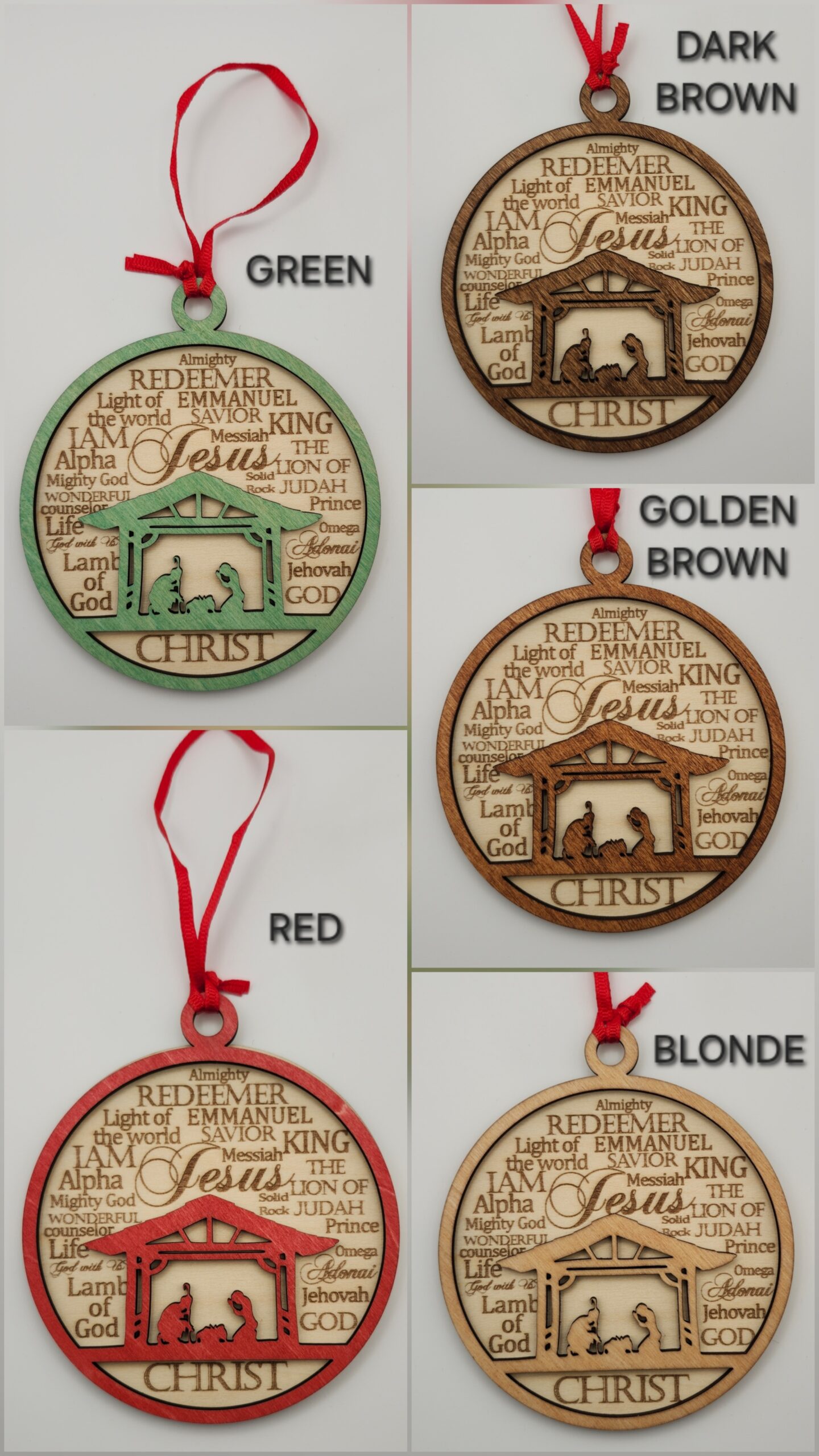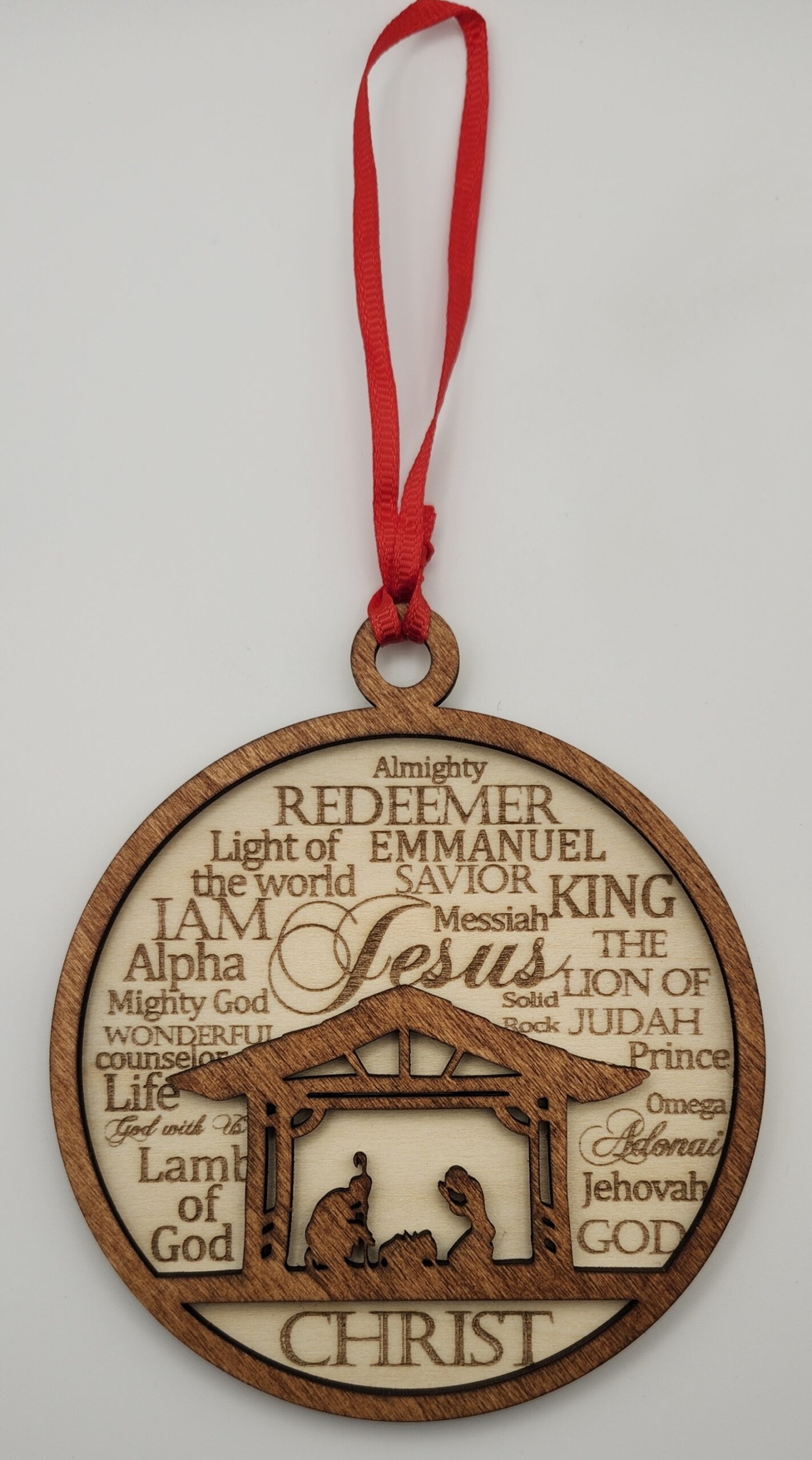 Celebrate the true meaning of Christmas with this two-layer, laser-cut “Titles of Christ” ornament. The top layer features a beautifully detailed manger scene with silhouettes of Mary, Joseph, and baby Jesus, while the background layer is engraved with a radiant word collage featuring several names of Jesus.